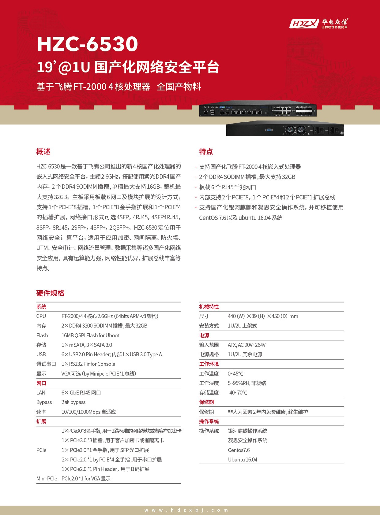 HZC-6530是一款基于飞腾公司推出的新4核处理器全国产化物料的嵌入式网络安全平台,主频2.6GHz,搭配使用紫光DDR4国产内存,2个DDR4 SODIMM插槽, 单槽最大支持16GB,整机最大支持32GB。主板采用板载6网口及模块扩展的设计方式,搭配兆芯ZX-200桥片,支持丰富的PCI-E总线扩展,网络接口形式可选4SFP,4RJ45,8SFP,8RJ45,2SFP+,4SFP+。HZC-6530定位用于网络安全计算平台,适用于应用加密、网闸隔离、防火墙、UTM、安全审计、网络流量管理、数据采集等诸多国产化网络安全应用,具有运算能力强,网络性能优异,扩展总线丰富等特点。